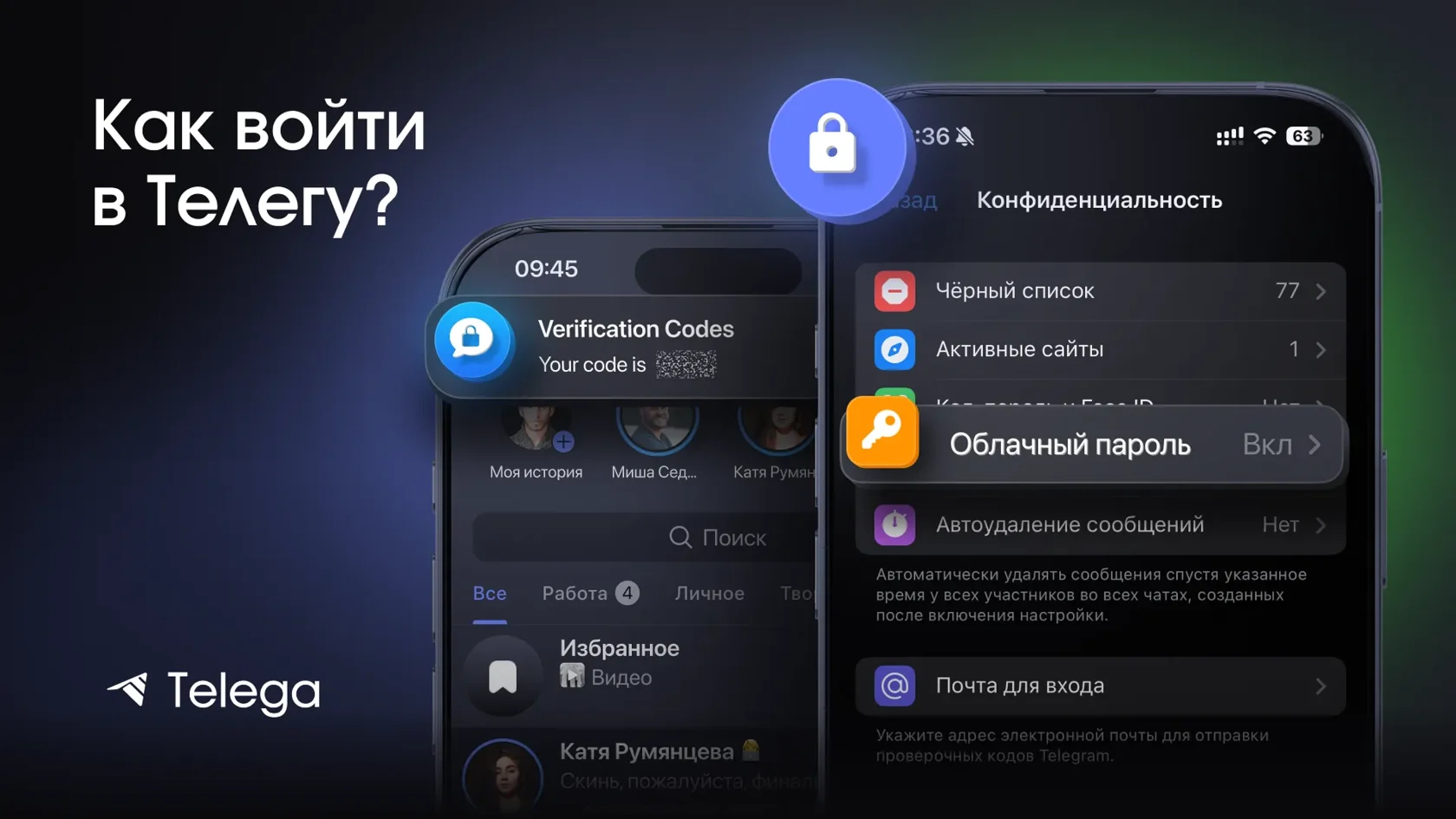 Отвечаем за минуту: Телега — клиент на базе открытого кода Telegram. Вы входите по тому же номеру телефона, все чаты/каналы/медиа синхронизируются автоматически. Коды авторизации генерирует и отправляет Telegram. Код может прийти в ваш Telegram на авторизованном устройстве или на e-mail. Процедуры входа и восстановления — как в Telegram. Управление сессиями, паролями, 2FA и блокировками происходит на стороне Telegram.
